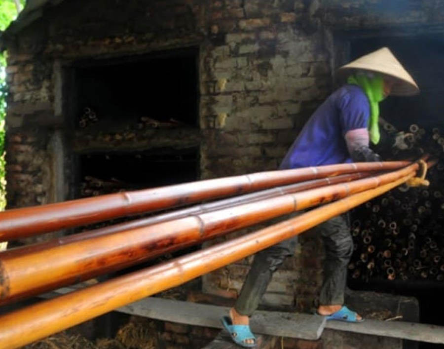 - Sấy khô và hun khói tre để làm mất nước còn lại trong tre và tăng độ cứng cáp của tre.